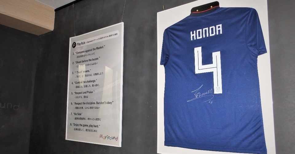 私たちのオフィスに 本田圭佑さんのサイン入りユニフォームを飾りました Playground株式会社